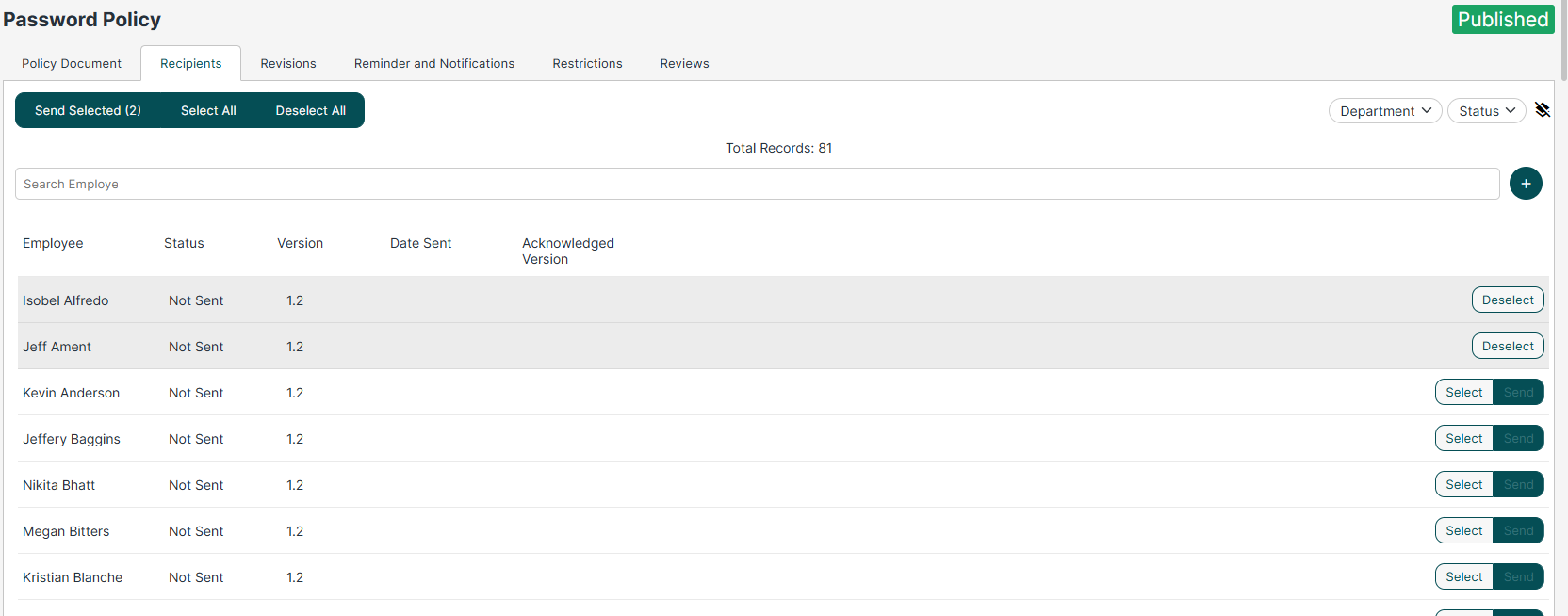 To do this click on the Recipients tab, select the employees you wish to send the policy to (or click select all) then click 'Send Selected'. This will email the employees asking them to acknowledge the policy. Each of the employees will ask see a task in their employee dashboard.